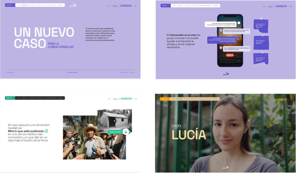 Semanalmente, los participantes reciben un correo electrónico con una invitación a sumergirse en un nuevo módulo virtual. Su misión es resolver un caso ficticio que se conecta directamente con el trabajo consular. Para ello, deben interactuar con materiales sonoros y fotográficos, completando desafíos de forma individual y asincrónica.